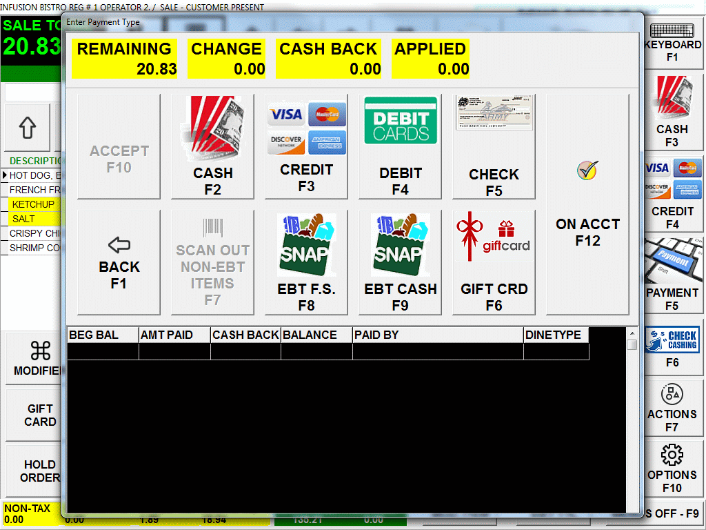 Plexis POS supports Credit Card, Debit Card and EBT Payment Tenders within any order. Use your existing credit card machine with ease. Simply ring up items as usual, choose the payment type (EBT, Credit, Debit), then process the customer card on your non integrated machine. Once you have an approved authorization choose accept on Plexis POS. You will then be immediately ready for your next transaction. Reporting in the Sales Register, X & XX Register will reflect the various payment types. After Posting your daily sales the EBT amounts will be transferred to the General Ledger and other accounting modules. |
